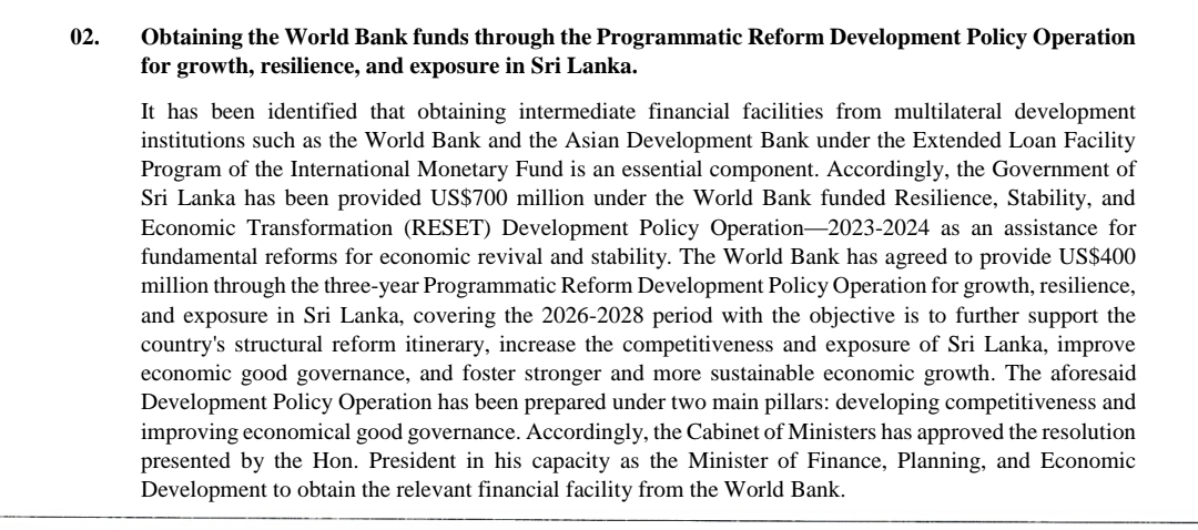 The Cabinet has approved obtaining a US$400 million financial facility from the World Bank under a three-year Programmatic Reform Development Policy Operation covering 2026–2028.