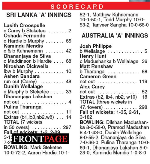 Australia ‘A ‘opener Henry Hunt scored 36 while his partner Josh Phillippe who was out first off the bowling of young leg spinner Dunith Wellalage. Wellalage made an early breakthrough in his first over to dismiss Phillippe.