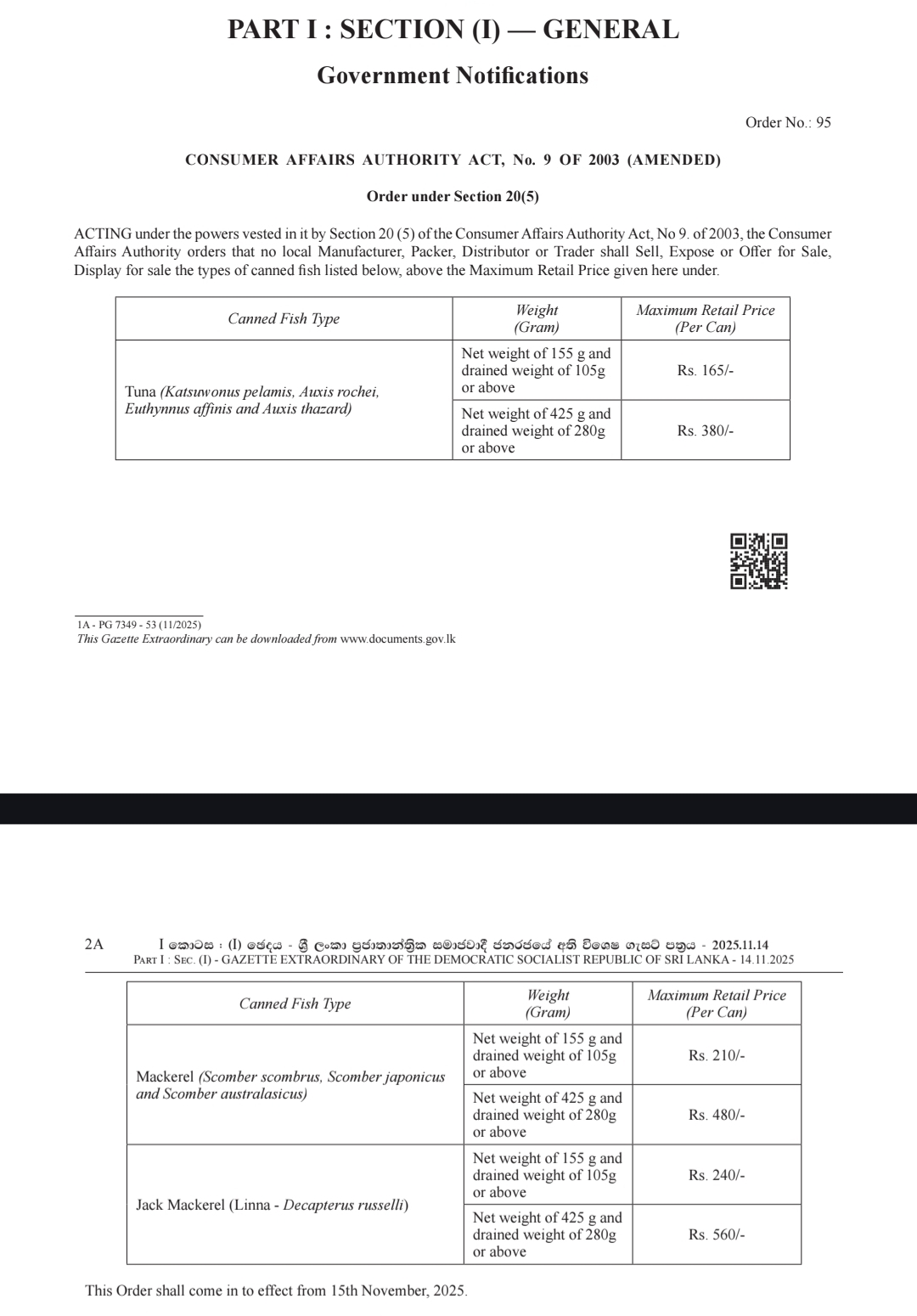 A Gazette has been issued amending the maximum retail prices for canned fish, effective from today (15).