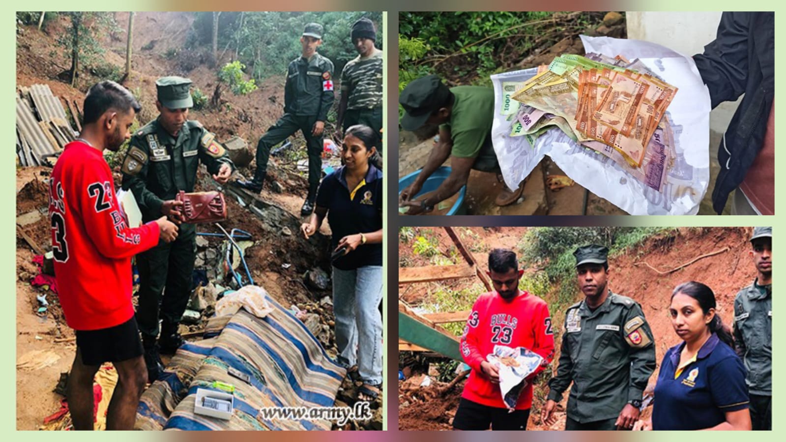 The Army said troops attached to the Hanguranketha Divisional Secretariat found Rs. 300,000 in cash and gold jewellery valued at around Rs. 5 million while continuing search operations amid the rubble. The recovered items were safely and formally handed over to the owner on December 14. (Newswire)
