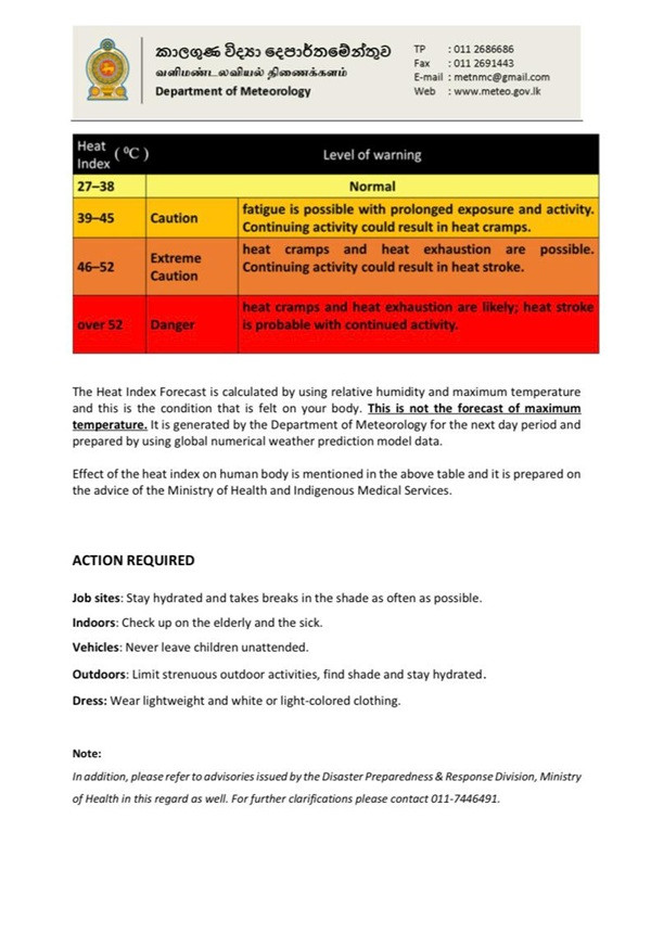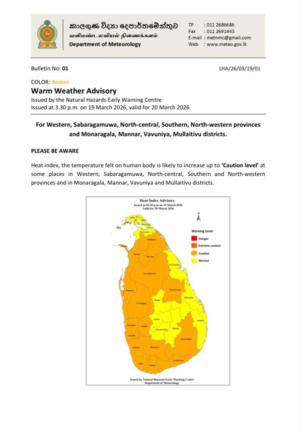 The Department of Meteorology has issued an advisory for warm weather in the Western, Sabaragamuwa, North-central, Southern, North-western provinces and Monaragala, Mannar, Vavuniya, Mullaitivu districts.