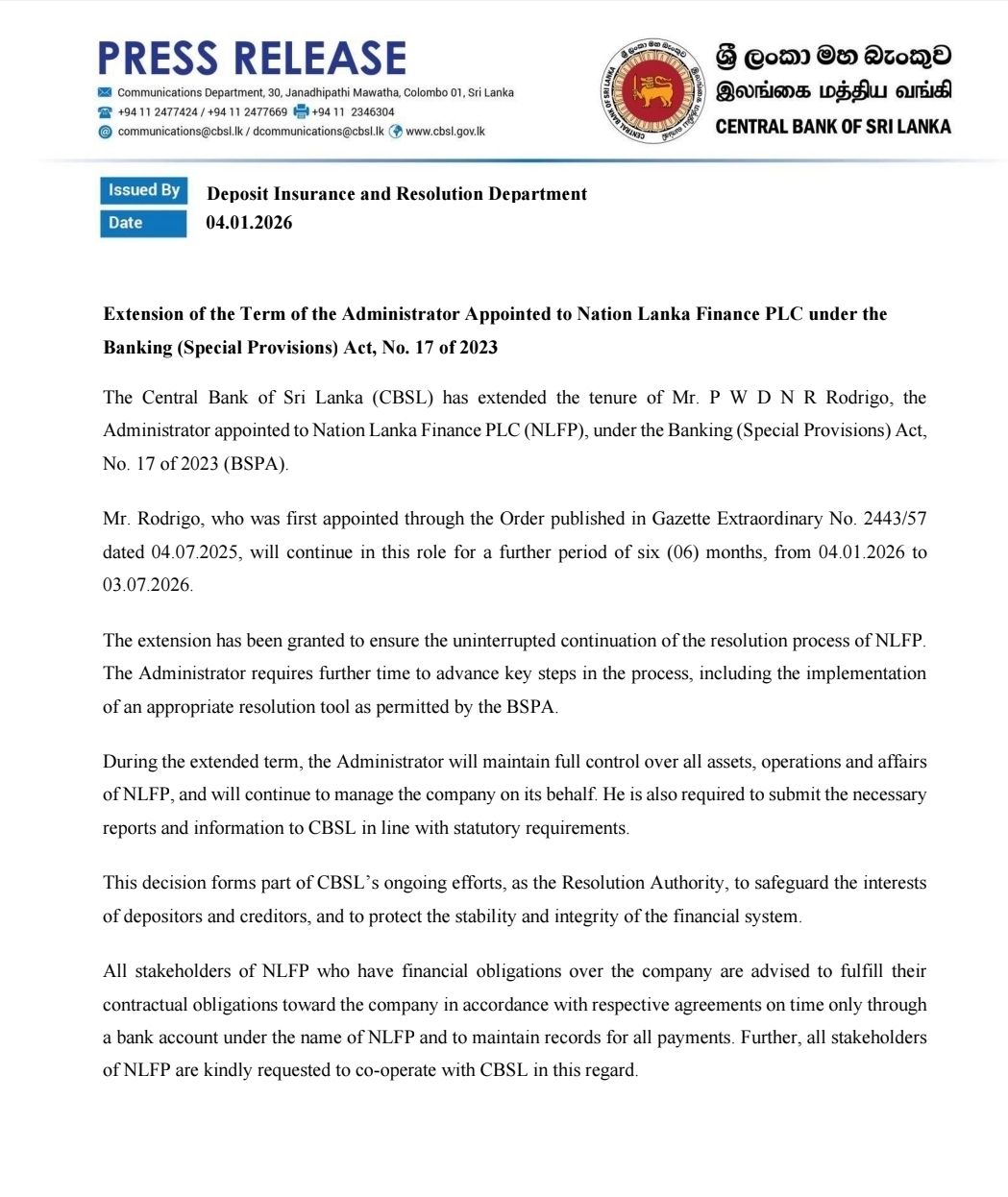 The Central Bank of Sri Lanka has extended the term of the administrator appointed to Nation Lanka Finance PLC by a further six months, to ensure the uninterrupted continuation of the company’s resolution process.