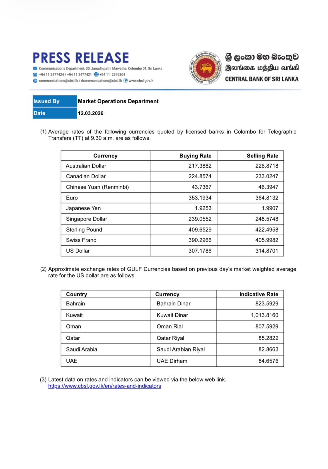 According to the Central Bank of Sri Lanka, the buying rate of the US Dollar has dropped slightly from Rs. 307.18 to Rs. 307.17 while the selling rate has slightly increased from Rs. 314.86. to Rs, 314.87.