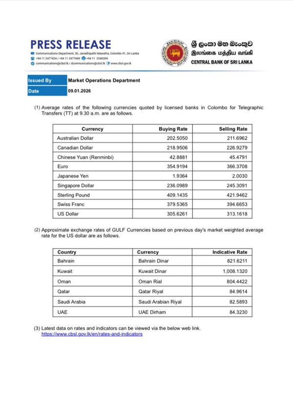 According to official Central Bank data, the buying rate of the US Dollar has reduced from Rs. 306.32 to Rs. 305.62, while the selling rate has dropped from Rs. 313.84 to Rs. 313.16.
