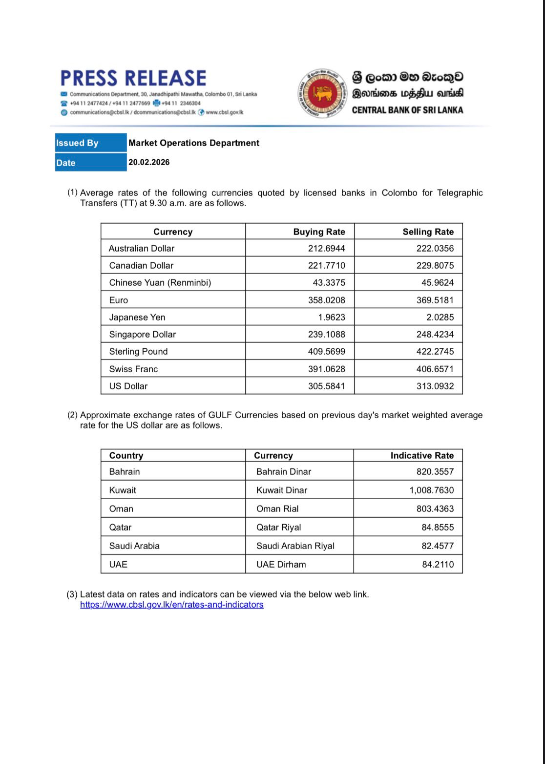 According to the Central Bank of Sri Lanka, the buying rate of the US Dollar has increased from Rs. 305.63 to Rs. 305. 58 while the selling rate has also increased from Rs. 313.14 to Rs. to Rs. 313.09
