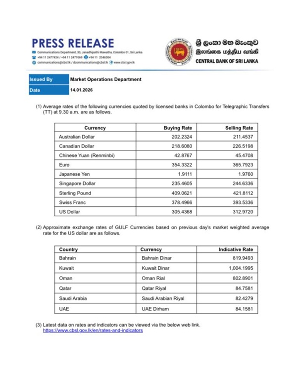 The Sri Lankan Rupee has depreciated slightly against the US Dollar today (14 Jan), compared to Tuesday.