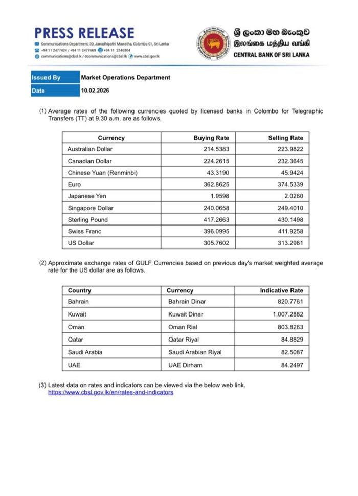According to the Central Bank of Sri Lanka, the buying rate of the US Dollar has increased from Rs. 305.72 to Rs. 305.76, while the selling rate has also increased from Rs. 313.26 to Rs. 313.29.
