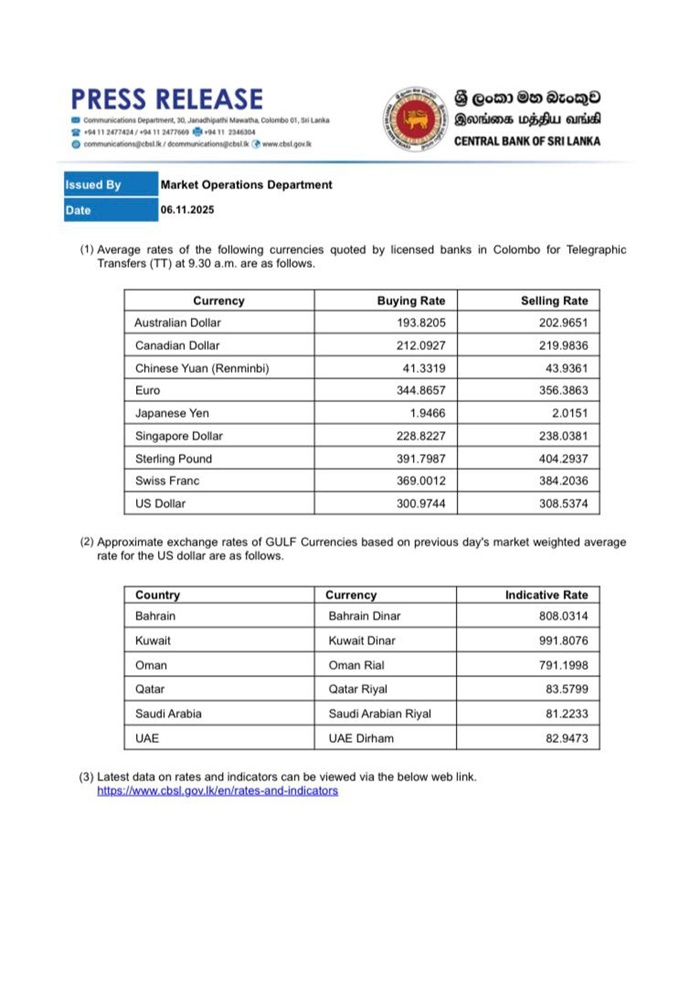 Meanwhile, the selling rate of the Sri Lankan Rupee has also increased from Rs. 308.20 to Rs. 308.53.