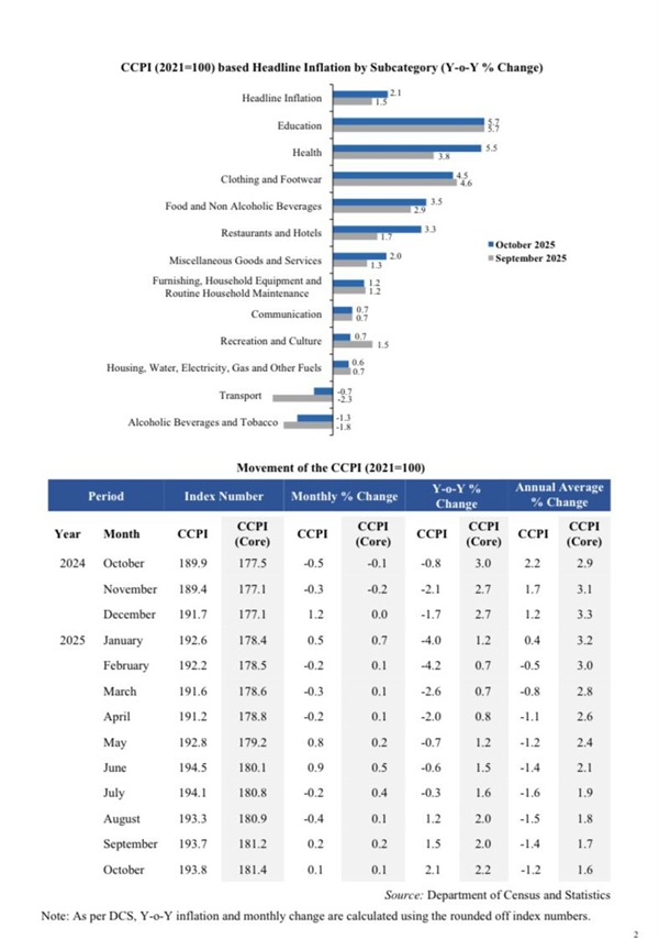 According to the Central Bank of Sri Lanka, headline inflation (Y-o-Y) increased to 2.1% in October 2025 from 1.5% in September 2025, in line with the Central Bank’s near-term projections.