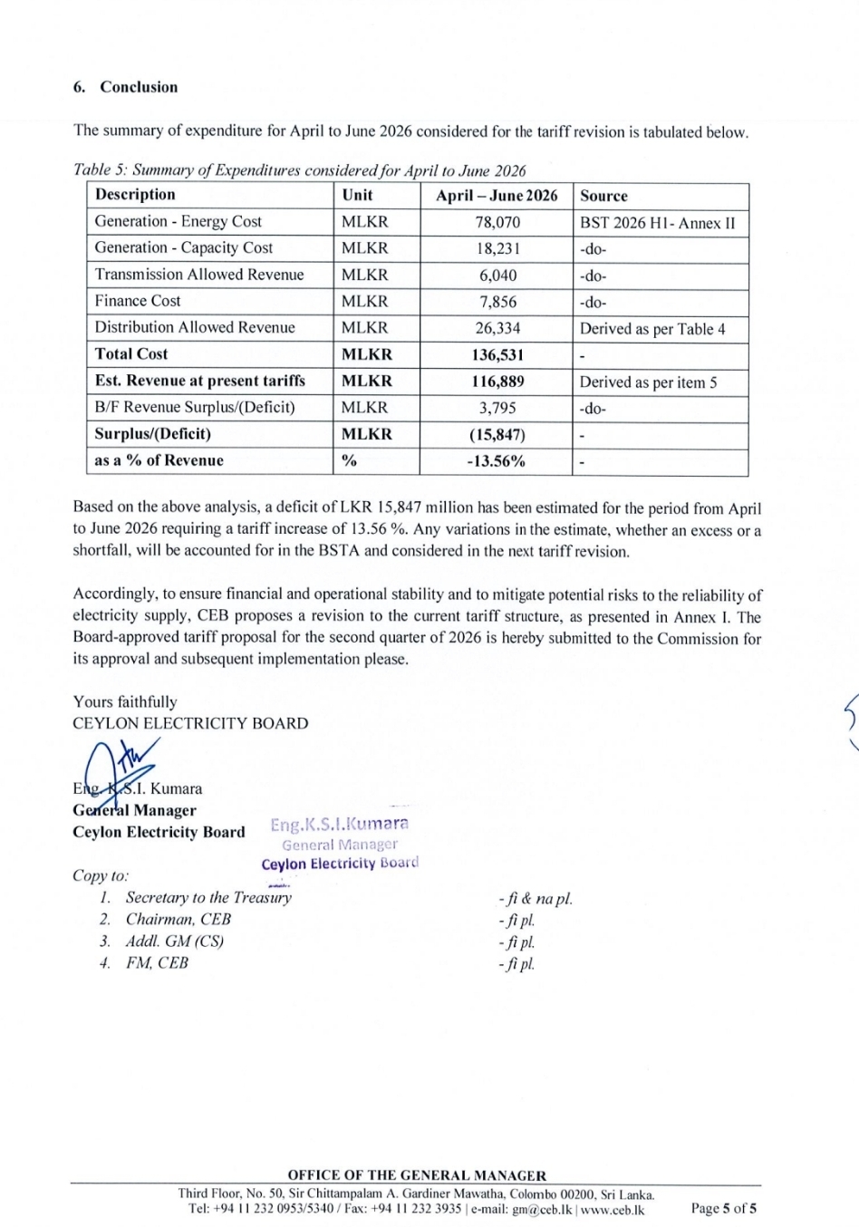 The Ceylon Electricity Board (CEB) has proposed a 13.56% increase in electricity tariffs for the second quarter of 2026, citing an estimated revenue deficit of Rs. 15.8 billion from April to June.