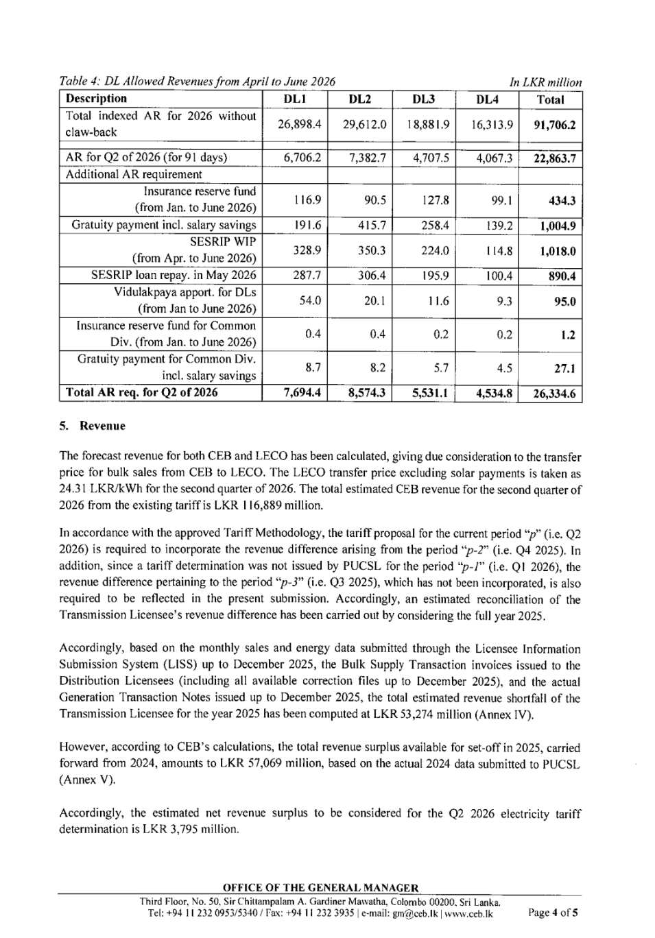 In a submission dated February 13 to the Public Utilities Commission of Sri Lanka (PUCSL), the CEB said the total projected cost for the April–June period stands at Rs. 136.5 billion, while estimated revenue at existing tariffs amounts to Rs. 116.9 billion.
