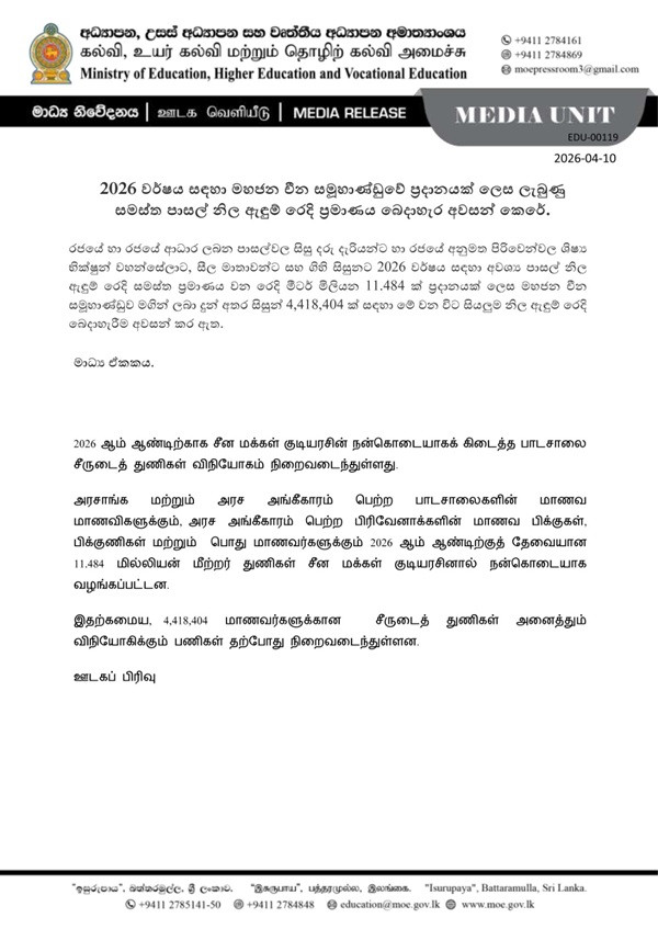 The Ministry of Education has announced that the distribution of school uniform material donated by the People’s Republic of China for the year 2026 has been completed.