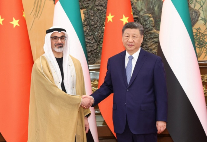 Chinese President Xi Jinping met with Sheikh Khaled bin Mohamed bin Zayed Al Nahyan, Crown Prince of Abu Dhabi, at the Great Hall of the People in Beijing, where the two leaders exchanged views on the current situation in the Middle East and Gulf region.