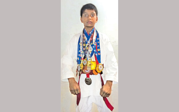 Twelve year old Karateka and Gold Medalist of the India Nepal and Sri Lanka Tri Nation Karate Tournament held in Sri Lanka Chiran Lasitha Wijewardena has brought honour and glory to his alma mater Royal College Wayamba Kurunegala and his motherland in Karate.