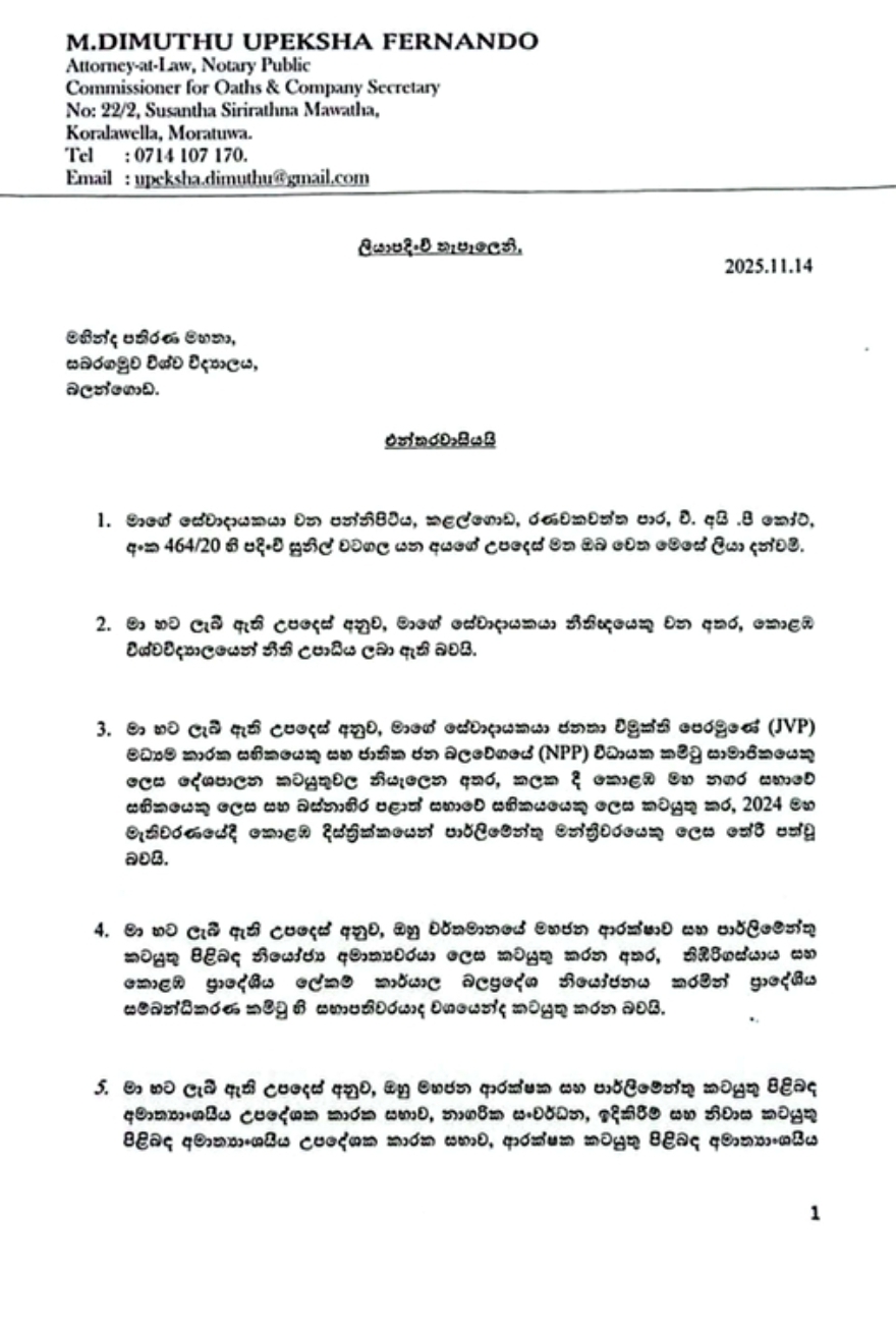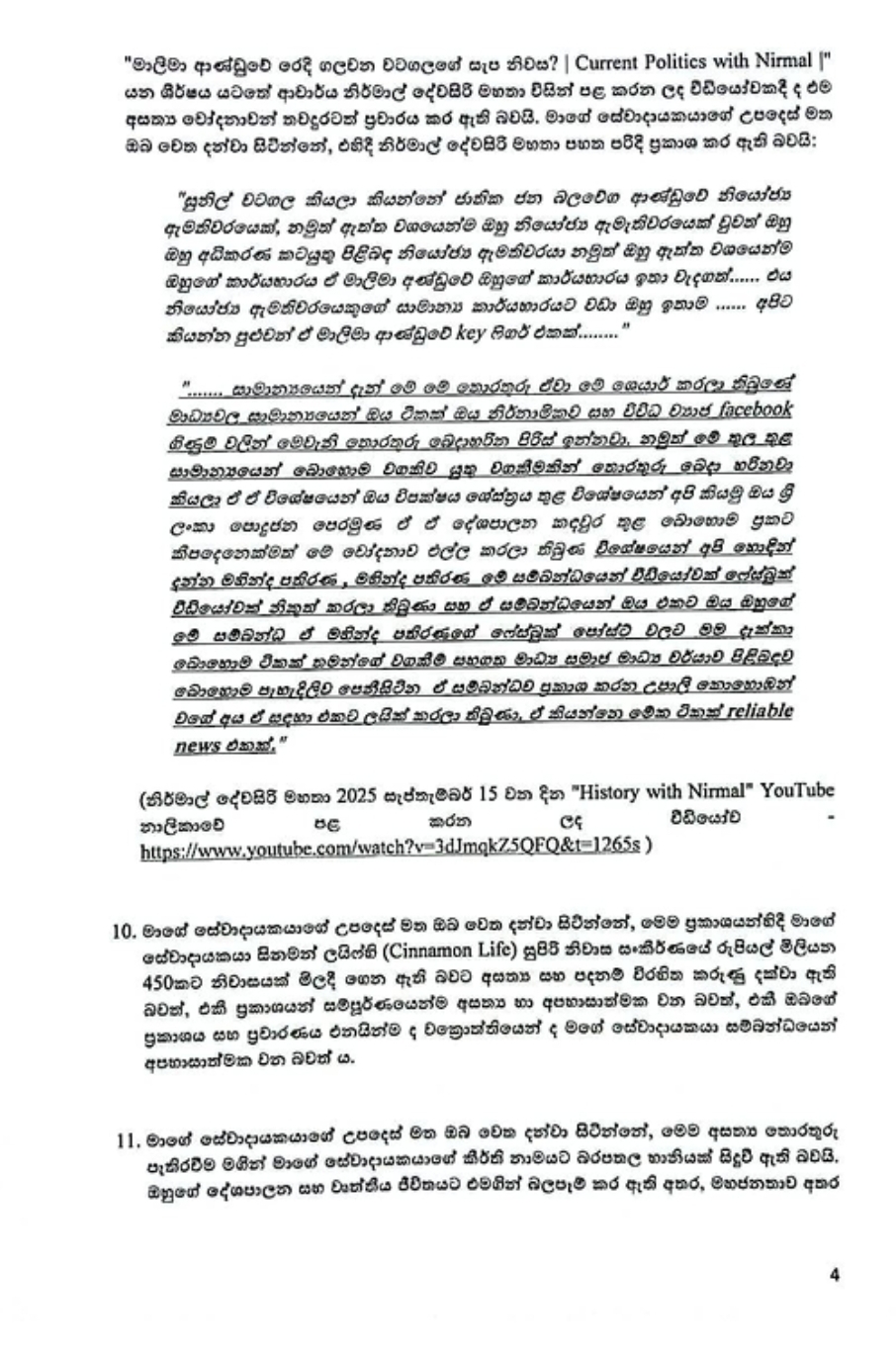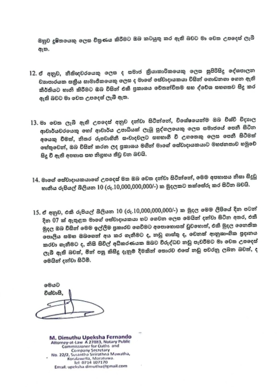 A demand letter seeking Rs. 10 billion in compensation has been issued against SLPP Activist Mahinda Pathirana over an alleged defamatory statement made against Deputy Minister of Public Security Sunil Watagala.