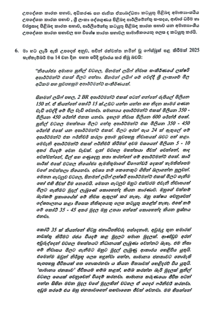 Social media posts had also alleged that the Deputy Minister purchased a house in a Cinnamon Life residential complex in Colombo. Watagala later clarified via Facebook that the claim was entirely false and defamatory, noting that he has never engaged in any act that would betray the trust placed in him by the public or his party. (Newswire)