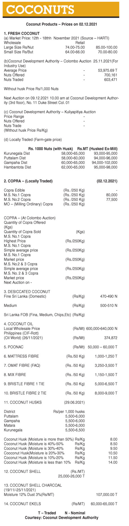 Coconut ( Coconut Products – Prices on 02.12.2021 ) Local On Dec 2, 2021 Coconut ( Coconut Products – Prices on 02.12.2021 ) 0 42 Share Business Tags: Print Edition Friday, December 3, 2021 – 01:00 0 42 Share FacebookTwitterGoogle+ReddItWhatsAppPinterestEmail