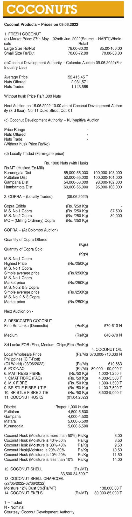 Coconut ( Coconut Products – Prices on 09.06.2022) Business On Jun 9, 2022 0 59 Share Business Tags: Print Edition Coconut Friday, June 10, 2022 – 01:00 0 59 Share FacebookTwitterGoogle+ReddItWhatsAppPinterestEmail