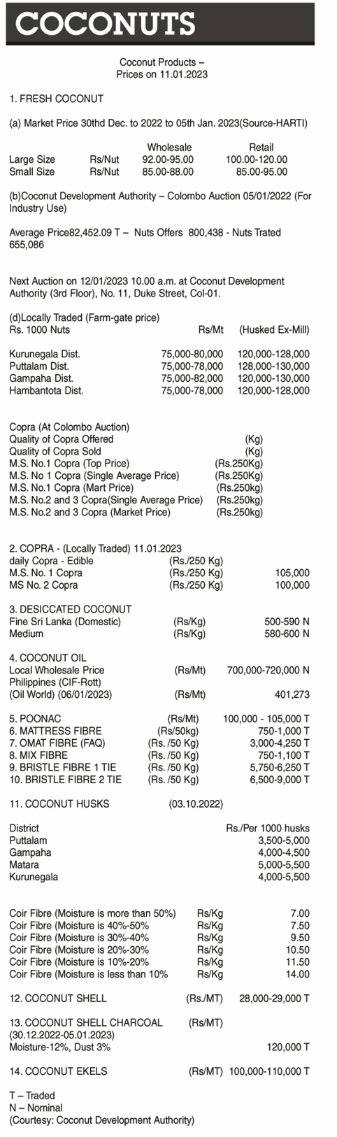 Coconut (Coconut Products – Prices on 11.01.2023 ) Business On Jan 11, 2023 Untitled 41 2 0 91 Share Business Tags: Print Edition Coconut Thursday, January 12, 2023 – 01:00 0 91 Share FacebookTwitterGoogle+ReddItWhatsAppPinterestEmail