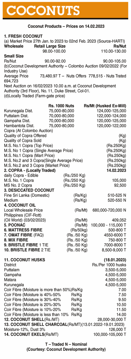 Coconut ( Coconut Products – Prices on 14.02.2023 ) Business On Feb 14, 2023 Untitled 33 1 0 56 Share Business Tags: Print Edition Coconut Wednesday, February 15, 2023 – 01:00 0 56 Share FacebookTwitterGoogle+ReddItWhatsAppPinterestEmail