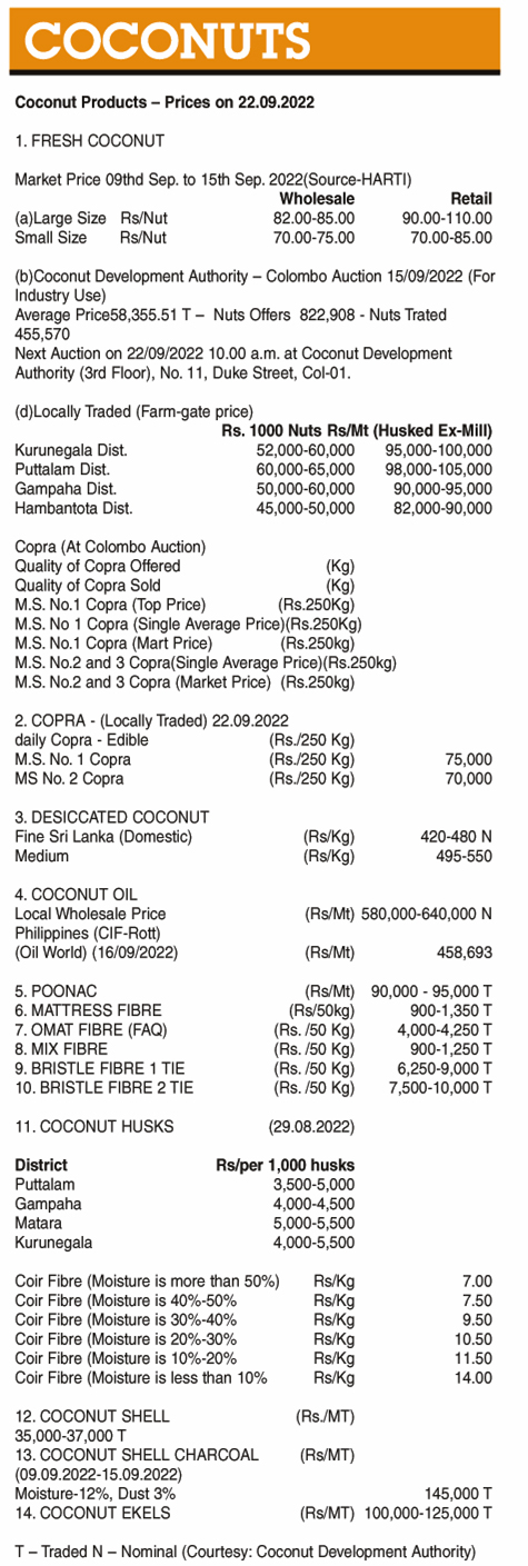 Coconut ( Coconut Products – Prices on 22.09.2022) Business On Sep 22, 2022 Coconut ( Coconut Products – Prices on 22.09.2022) 0 66 Share Business Tags: Print Edition Coconut Friday, September 23, 2022 – 01:00 0 66 Share FacebookTwitterGoogle+ReddItWhatsAppPinterestEmail