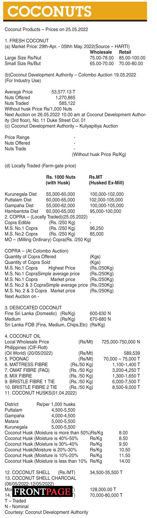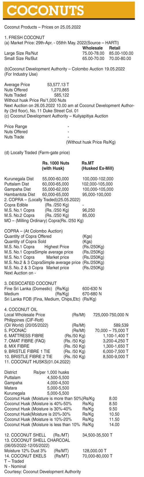 Coconut ( Coconut Products – Prices on 25.05.2022) Business On May 25, 2022 0 35 Share Business Tags: Print Edition Coconut Thursday, May 26, 2022 – 01:00 0 35 Share FacebookTwitterGoogle+ReddItWhatsAppPinterestEmail