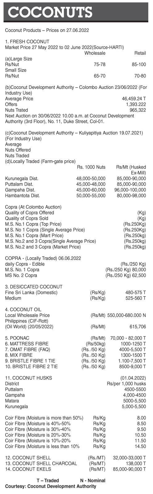 Coconut (Coconut Products – Prices on 27.06.2022 ) Business On Jun 27, 2022 0 38 Share Business Tags: Print Edition Coconut Tuesday, June 28, 2022 – 01:00 0 38 Share FacebookTwitterGoogle+ReddItWhatsAppPinterestEmail