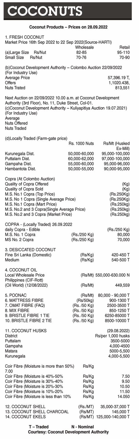 Coconut ( Coconut Products – Prices on 28.09.2022 ) Business On Sep 28, 2022 Coconut ( Coconut Products – Prices on 28.09.2022 ) 0 82 Share Business Tags: Print Edition Coconut Thursday, September 29, 2022 – 01:00 0 82 Share FacebookTwitterGoogle+ReddItWhatsAppPinterestEmail