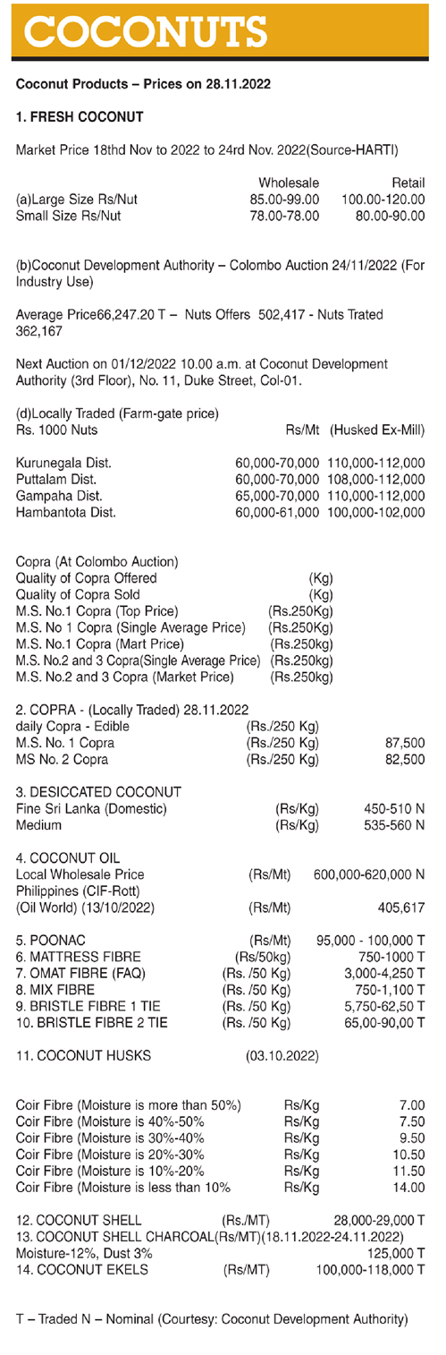 Coconut ( Coconut Products – Prices on 28.11.2022 ) Business On Nov 28, 2022 Untitled 46 0 50 Share Business Tags: Print Edition Coconut Tuesday, November 29, 2022 – 01:00 0 50 Share FacebookTwitterGoogle+ReddItWhatsAppPinterestEmail
