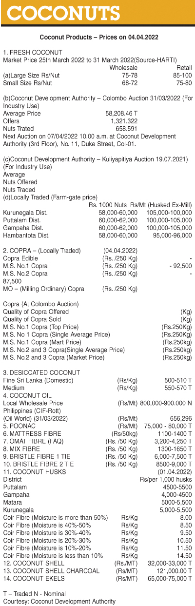 Coconut Products – Prices on 04.04.2022 Business On Apr 4, 2022 0 47 Share Business Tags: Print Edition Tuesday, April 5, 2022 – 01:00 0 47 Share FacebookTwitterGoogle+ReddItWhatsAppPinterestEmail