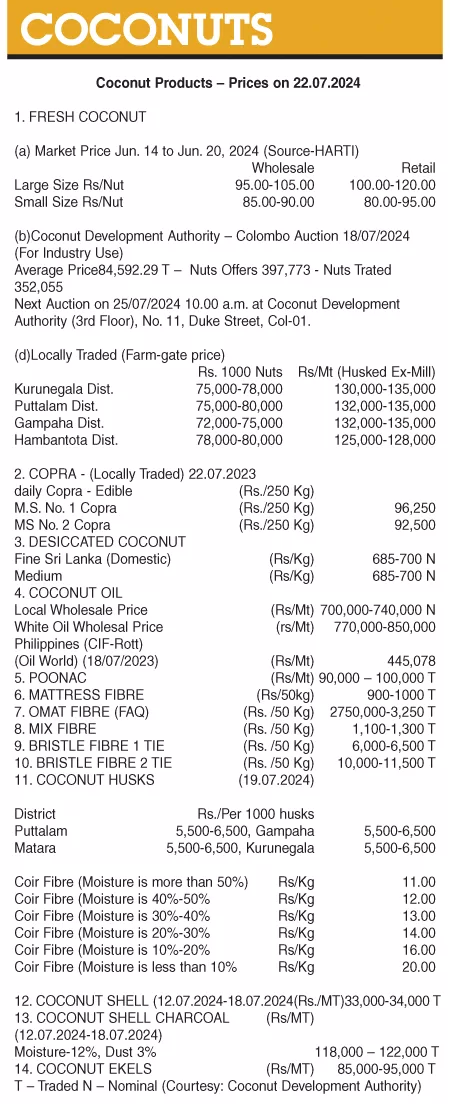 Coconut Products – Prices on 22.07.2024 Business On Jul 22, 2024 12 Coconuts 3 0 5 Share The post Coconut Products – Prices on 22.07.2024 appeared first on DailyNews. 0 5 Share FacebookTwitterGoogle+ReddItWhatsAppPinterestEmail