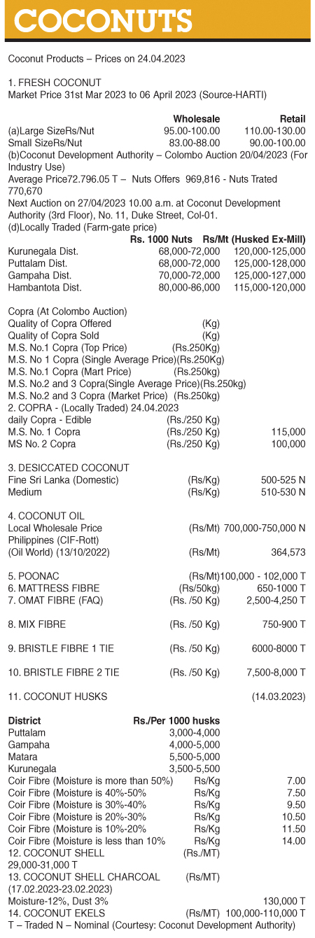 Coconut Products – Prices on 24.04.2023 Business On Apr 24, 2023 12 Coconuts 0 42 Share Business Tags: Print Edition Tuesday, April 25, 2023 – 01:00 0 42 Share FacebookTwitterGoogle+ReddItWhatsAppPinterestEmail