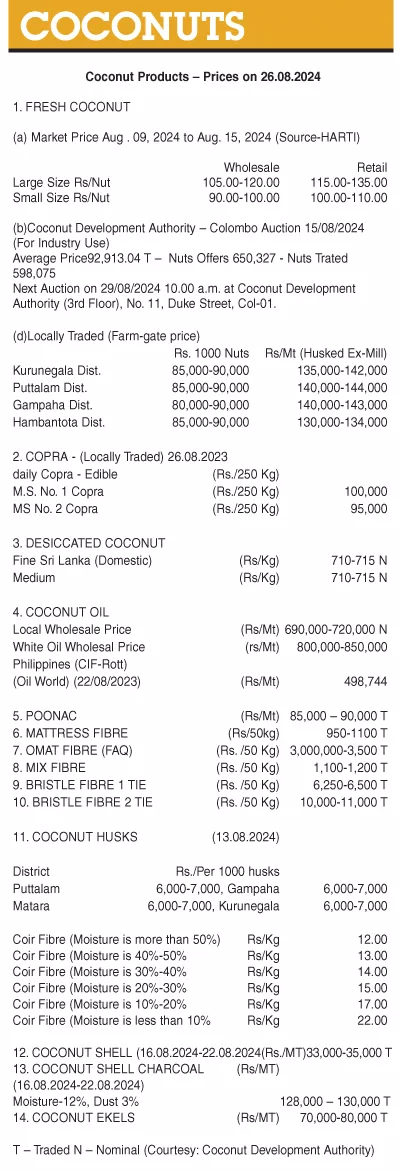 Coconut Products – Prices on 26.08.2024 Business On Aug 26, 2024 12 Coconuts 2 0 4 Share The post Coconut Products – Prices on 26.08.2024 appeared first on DailyNews. 0 4 Share FacebookTwitterGoogle+ReddItWhatsAppPinterestEmail