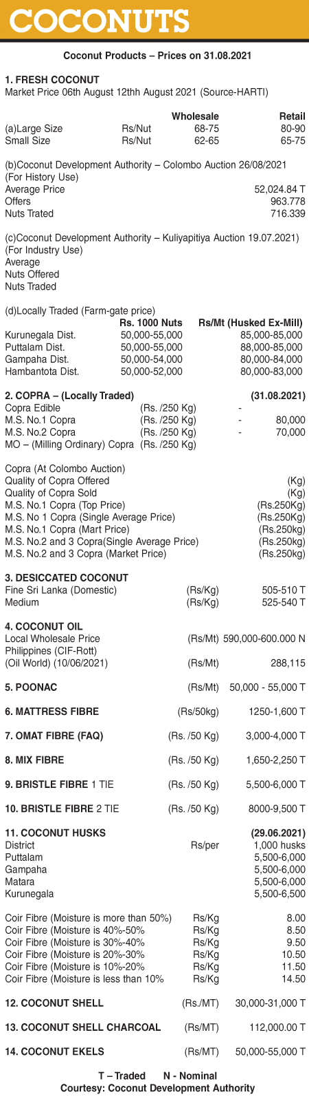 Coconut Products – Prices on 31.08.2021 Local On Aug 31, 2021 Coconut Products – Prices on 31.08.2021 0 49 Share Business Tags: Print Edition Wednesday, September 1, 2021 – 01:00 0 49 Share FacebookTwitterGoogle+ReddItWhatsAppPinterestEmail