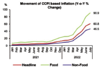 Accordingly, Food inflation (Y-o-Y) increased to 90.9% in July 2022 from 80.1% in June 2022, while Non-Food inflation (Y-o-Y) increased to 46.5% in July 2022 from 42.4% in June 2022.