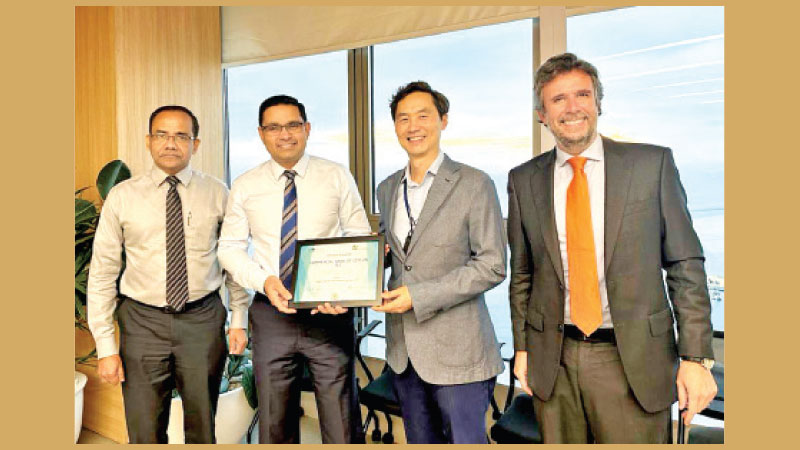 Commercial Bank’s Managing Director, CEO Sanath Manatunge (second from left) receives the award from the IFC’s FIG Portfolio Manager for South Asia Joon Young Park in the presence of Commercial Bank’s COO, S. Prabagar (extreme left) and IFC Country Manager for Sri Lanka Alejandro Alvarez de la Campa.