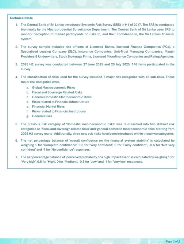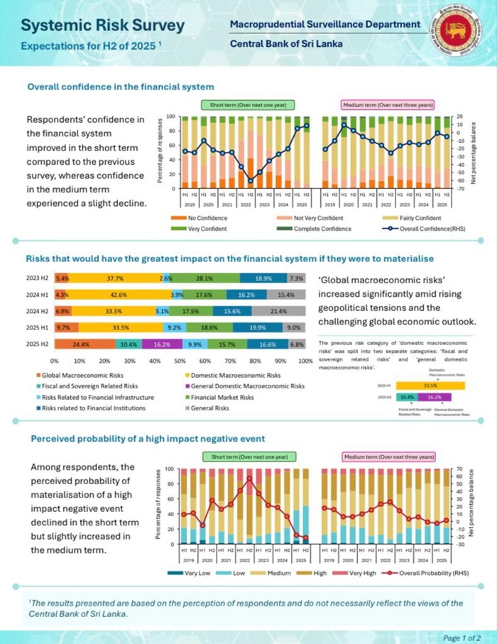 The semi-annual publications presenting the key findings of the 2025 SRSs are available on the CBSL website and can be accessed at: https://www.cbsl.gov.lk/en/publications/other-publications/systemic-risk-survey/ (Newswire)