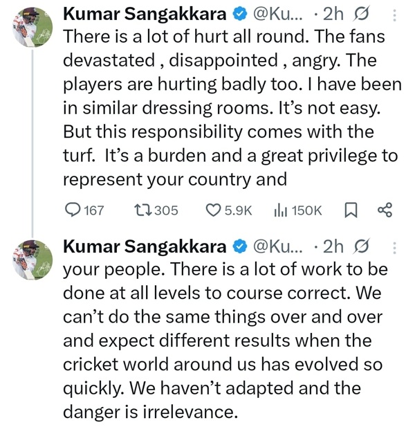 Former Sri Lankan skipper Kumar Sangakkara has spoken out on the current state of Sri Lankan cricket, acknowledging the pain felt by both fans and players after recent setbacks.