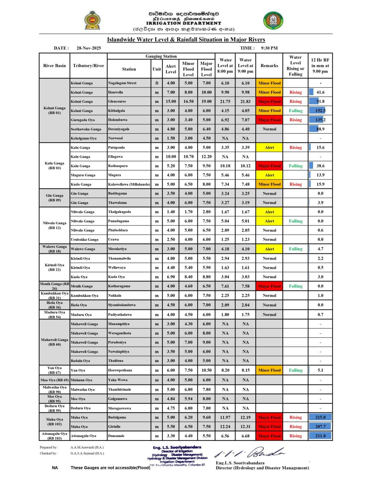 Significant concern has been raised over the Maha Oya basin, where Badalgama and Girulla stations have recorded major flood levels with rapidly rising water. Attanagalu Oya at Dunamale has also reached major flood level, posing increased risk to surrounding low-lying areas.