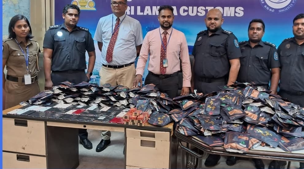 During inspection of their luggage, Customs officials discovered 84 used Apple mobile phones valued at approximately Rs. 5.3 million, along with 10,000 Chinese-manufactured cigarettes and 400 packets of Chinese sweetened betel weighing 40 kilograms.