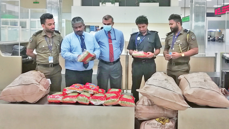 Customs officials at the Bandaranaike International Airport with the consignment of cardamom that they had seized.