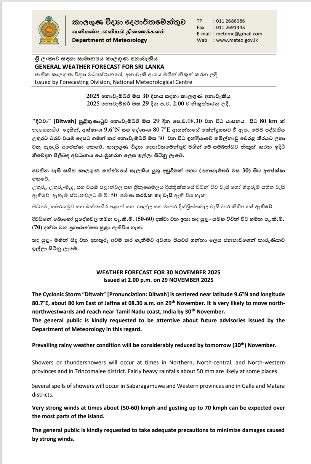 Moreover, due to the continuing indirect impact on Sri Lanka, wind speeds over the island and surrounding sea areas may increase to 60–70 km/h. Therefore, he advised fishermen and naval personnel to refrain from engaging in maritime activities today.