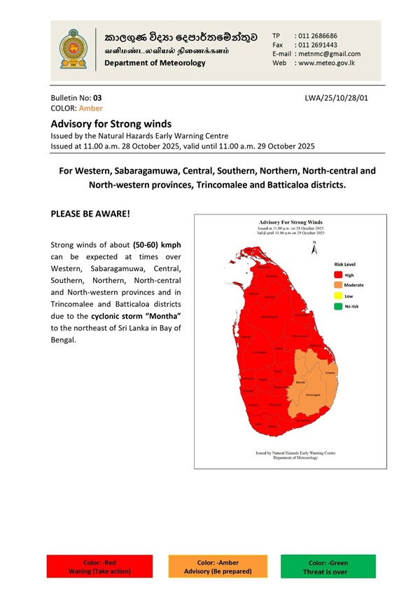 The Department of Meteorology has issued an advisory for strong winds in the Western, Sabragamuwa, Central, Southern, Northern, North-Central, and North-Western Provinces, and the Trincomalee and Batticaloa Districts, effective for the 24 hours ending at 11.00 am tomorrow (29).