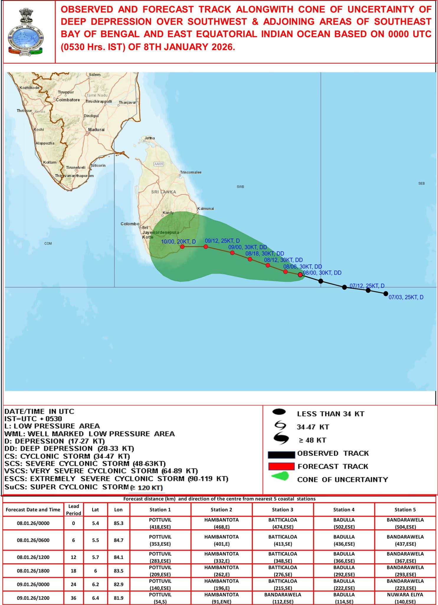 According to the IMD, the system is very likely to continue moving west-northwestwards across the southwest Bay of Bengal over the next 36 hours and cross the Sri Lanka coast between Hambantota and Kalmunai around the evening or night of January 9, 2026.