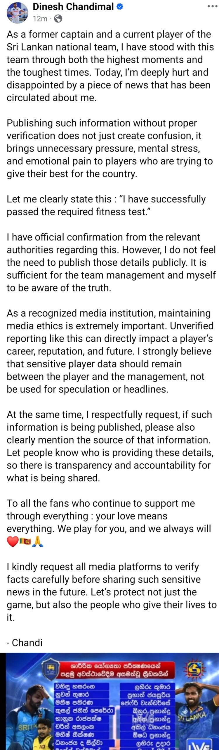 Chandimal thanked fans for their continued support and urged media organizations to verify facts carefully before publishing sensitive information related to players. (Newswire)