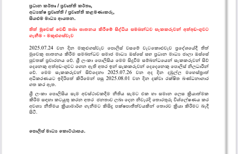 The incident, which drew widespread attention after being reported on social media and mainstream news on July 24, 2025, led to swift police action. The suspects were produced before the Dambulla Magistrate’s Court on July 26 and were remanded until August 1, 2025.