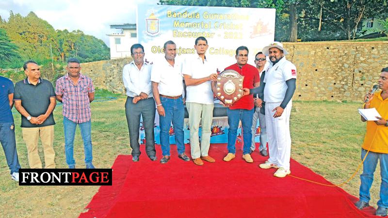 Upesh Wijesiri receiving ‘Bandula Gunaratne Memorial Trophy from Bandula’s brother, Wasantha Gunaratne Also in the picture. from left Kusal Ratnayake, Senaka Dissanayake, Tissa Jayasinghe, (President OBU) Thanuja Godewatte (President Cricket foundation), Kamal  Ariyasinghe (Principal) Ajith Palihakkara (Manager) and Prasad Gajaweera,