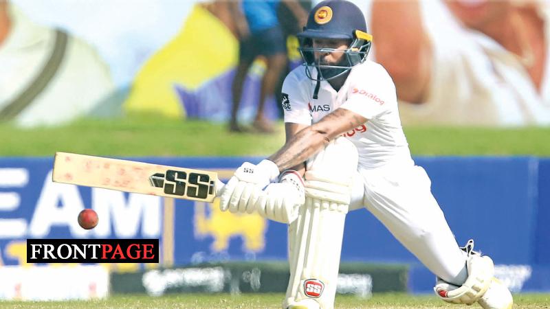 Niroshan Dikwella who scored his 21st Test half century playing a reverse sweep during his fighting knock at the first Test yesterday. (Pix courtesy SLC)
