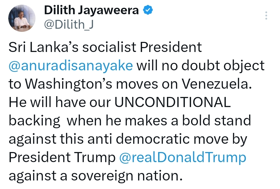In a post on X, Jayaweera said he expects Sri Lanka’s “socialist president” to object to the United States’ moves on Venezuela and expressed support for a bold response against what he termed an “anti-democratic move” by US President Donald Trump against a sovereign nation.