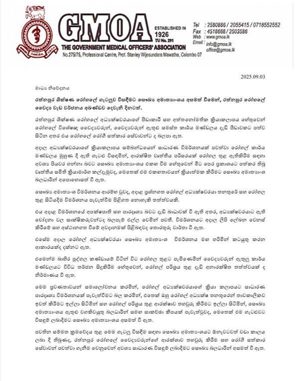 The GMOA says that due to the oppressive and arbitrary actions of the Director of the Ratnapura Teaching Hospital, the entire staff, including specialist doctors and medical officers, are under severe pressure, which affects the hospital’s patient care services.